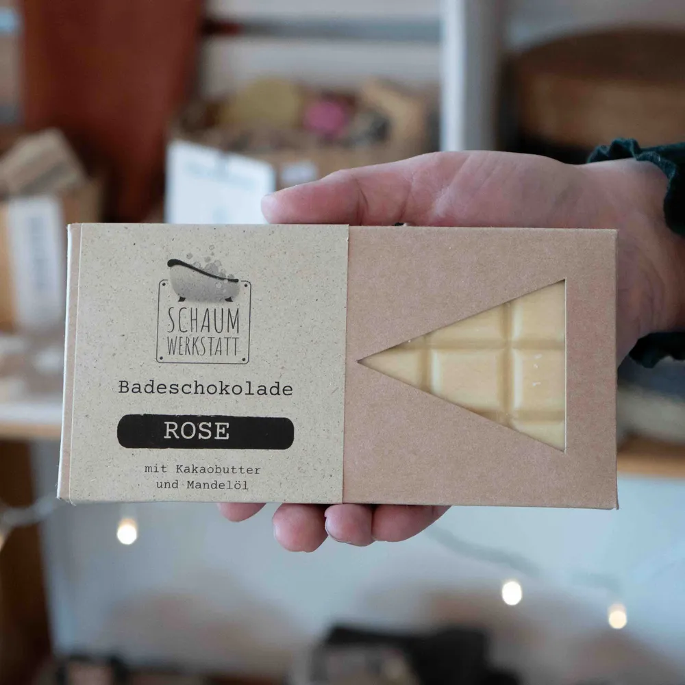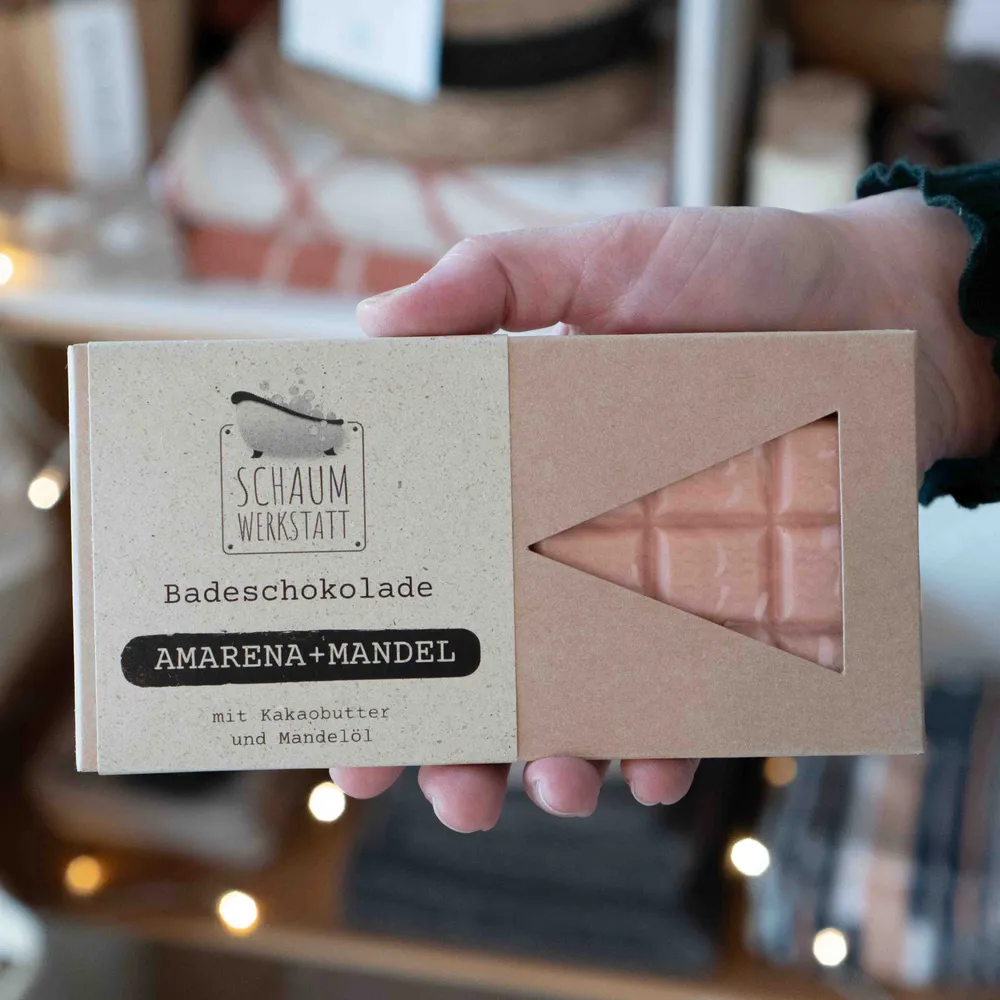 - Badeschokolade (100g) – wahlweise Amarena-Mandel oder Rose, mit Kakaobutter & Mandelöl