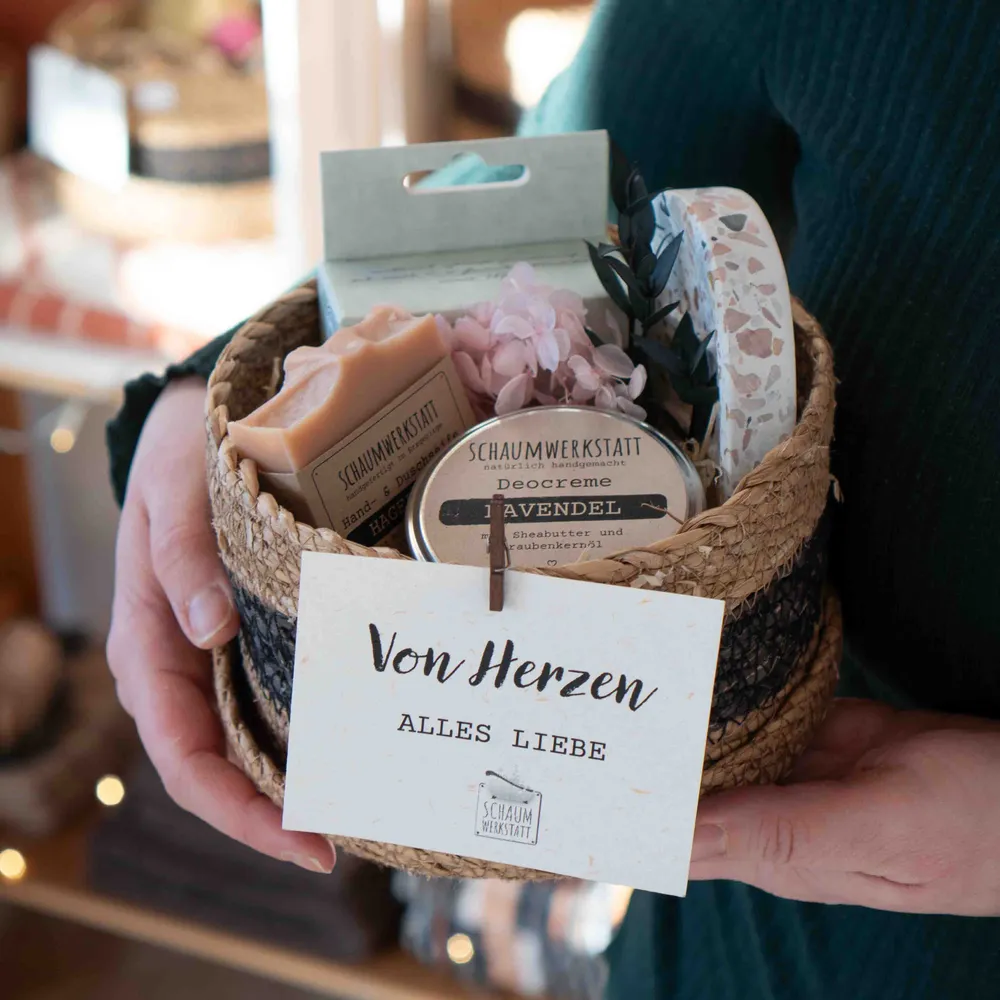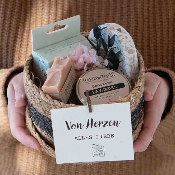 Ein liebevoll zusammengestelltes Geschenkset mit Hagebutten-Seife, Deocreme Lavendel, Seifenschale, Konjac-Schwamm und Anhänger – verpackt im stilvollen Seegraskörbchen. Perfekt für die beste Freundin oder zum Selbstverwöhnen.